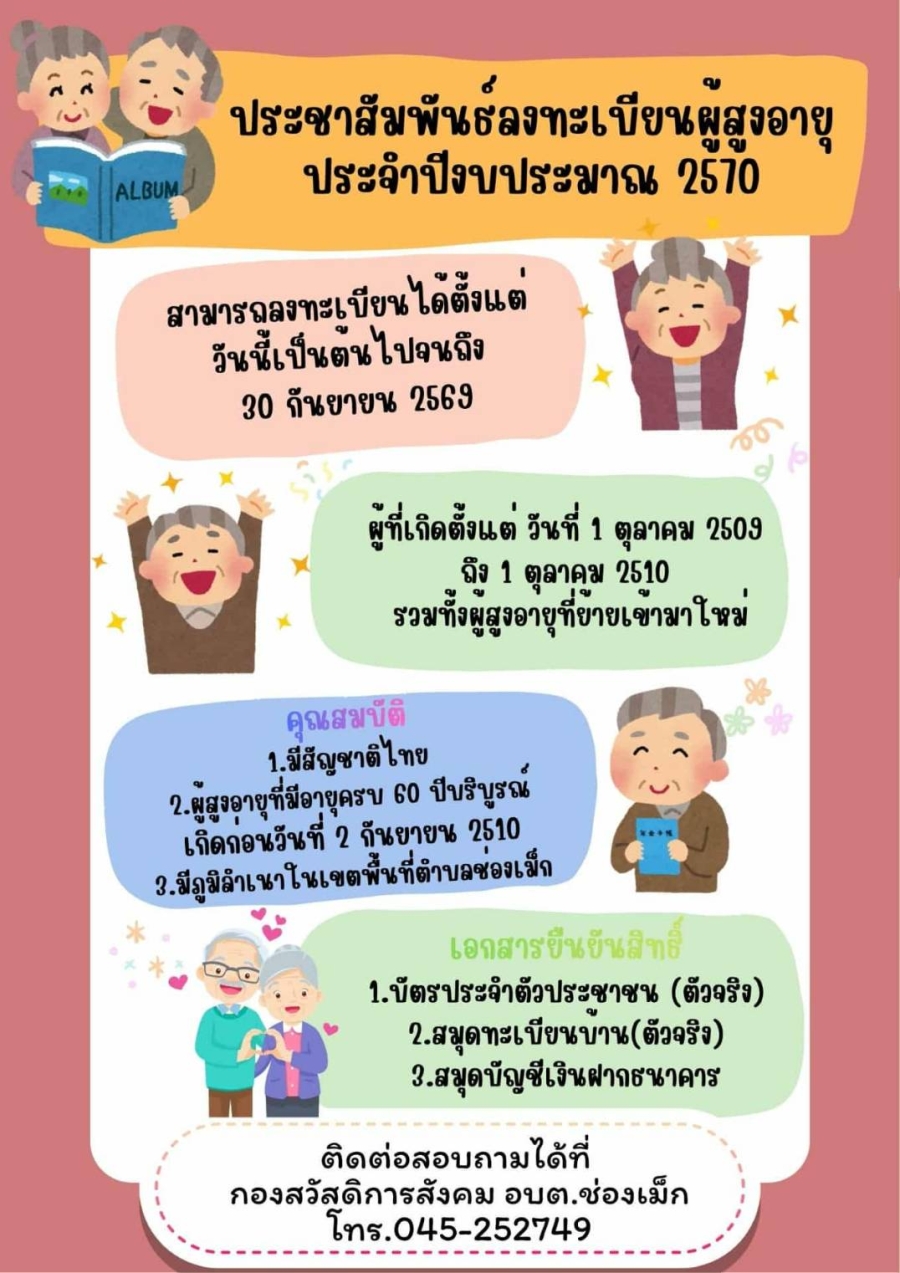 ขอเชิญชวนผู้สูงอายุลงทะเบียนขอรับเบี้ยยังชีพ ประจำปีงบประมาณ 2570 เพื่อป้องกันการเสียสิทธิประโยชน์ของท่าน