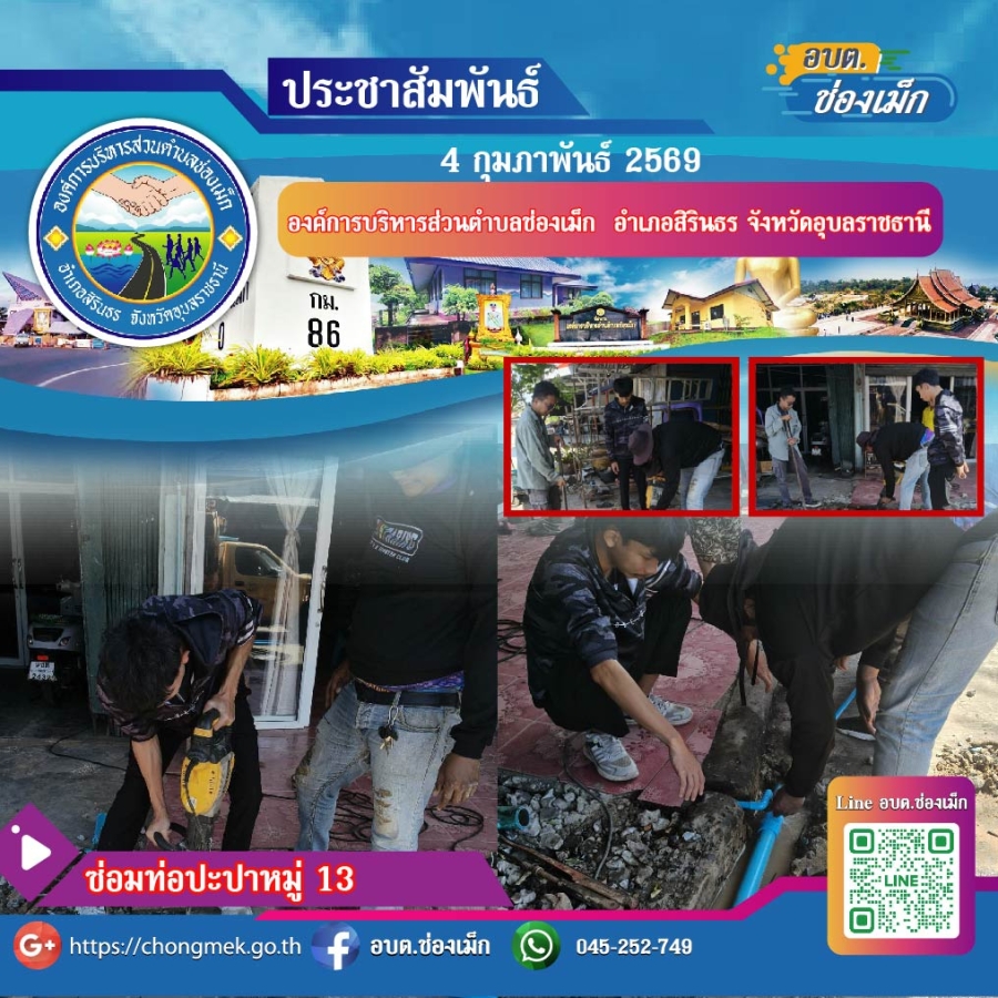 วันพุธ, 04 กุมภาพันธ์ 2569 14:174 4 กุมภาพันธ์ 2569 องค์การบริหารส่วนตำบลช่องเม็ก นายทรงศักดิ์ สุขผล นายกองค์การบริหารส่วนตำบล มอบหมายให้ ก่องช่าง ลงพื้นที่ ซ่อมท่อปะปาหมู่ 13