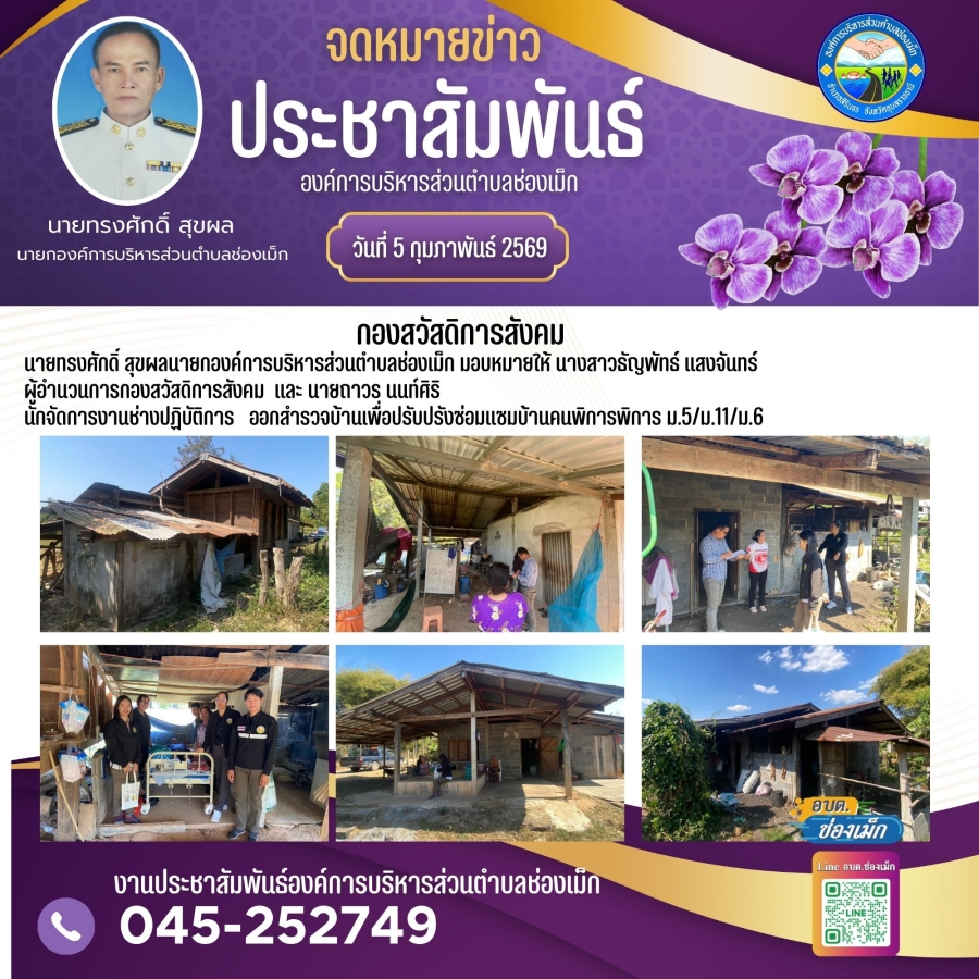 5 กุมภาพันธ์ 2569 องค์การบริหารส่วนตำบลช่องเม็ก นายทรงศักดิ์ สุขผลนายกองค์การบริหารส่วนตำบลช่องเม็ก มอบหมายให้ นางสาวธัญพัทธ์ แสงจันทร์ ผู้อำนวนการกองสวัสดิการสังคม และ นายถาวร นนท์ศิริ นักจัดการงานช่างปฏิบัติการ ออกสำรวจบ้านเพื่อปรับปรังซ่อมแซมบ